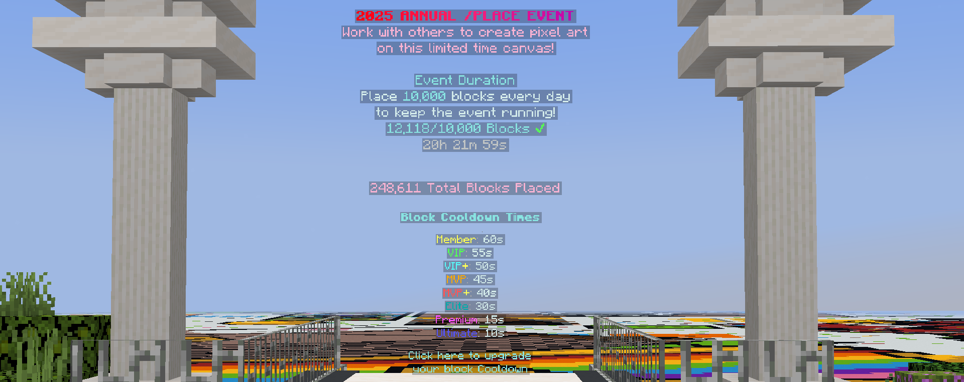 . Place was opened on September 13th 2025. There is be a daily quota of 10,000 blocks that players must meet in order to keep Place open. The daily quota was raised twice from 25,000 on the 23rd of September 2025 and then again to 45,000 on the 28th of September 2025. While at /spawn
