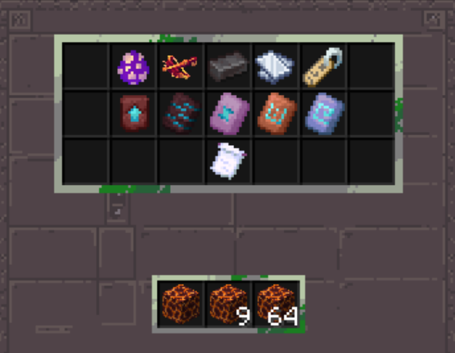 | Lava Golem | 400 | 1 Soul, 20 Mana | Gold Block | White Scroll, Netherite Scrap, Rare Enchant Book, Small Money Pouch, Enchantment Scroll, Sell Wand | Ancient Key, Inferno Sword | Lava Pickaxe, Lava Axe |